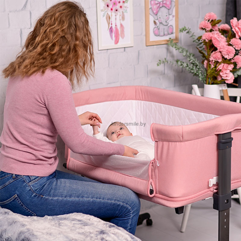 При установки кроватки возле кровати родителей, ребенок чувствует себя гораздо спокойнее. Боковая стенка легко опускается, для удобства доступа родителей к малышу. А регулировка высоты позволяет представить кроватку к любой кровати. На боковой стенке есть сетчатая областью на молнии, с помощью ее можно наблюдать за ребенком.