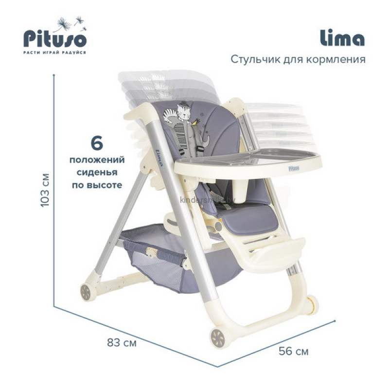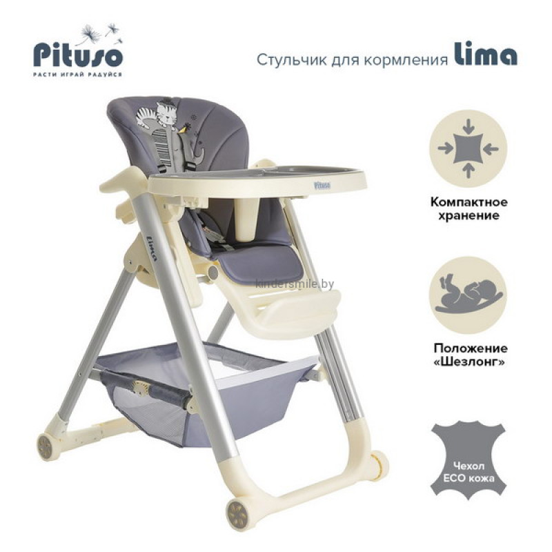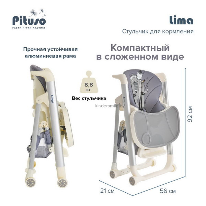 Pituso Lima – надежный, стильный и удобный стульчик для кормления. Алюминиевая рама создает устойчивость и надежность, а задние колесики оснащены педалью тормоза. Безопасная конструкция с мягким сидением из качественной экокожи, легко чистится и компактно складывается. Съемный столик подгоняется в наилучшее положение для кормления, а лоток для приема пищи отлично моется в посудомоечной машине.