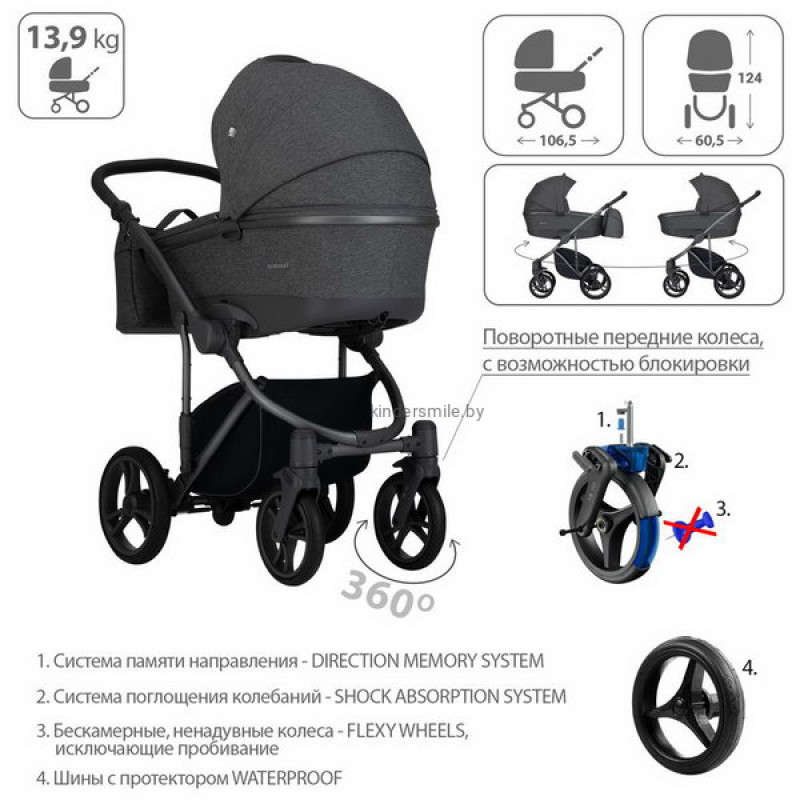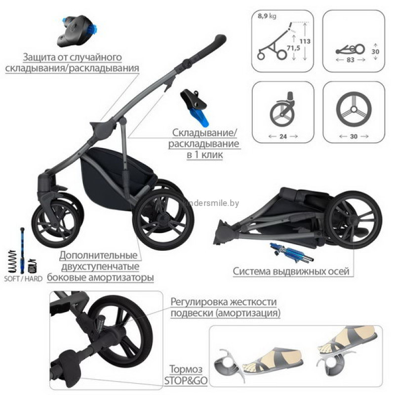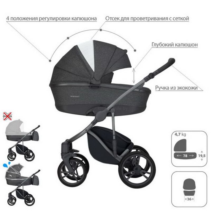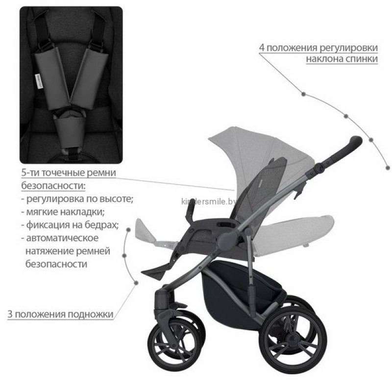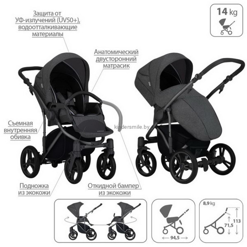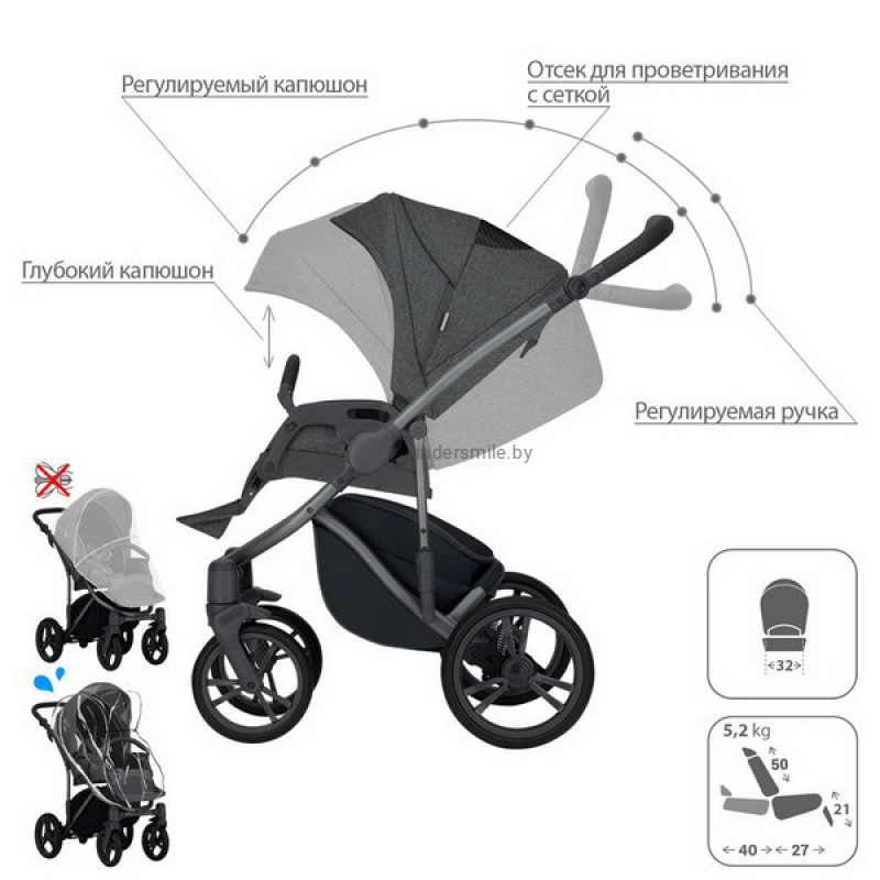- Обивка коляски: водоотталкивающая, съемная, с УФ-защитой 50+.