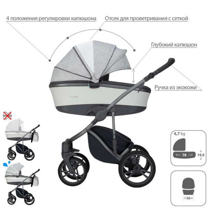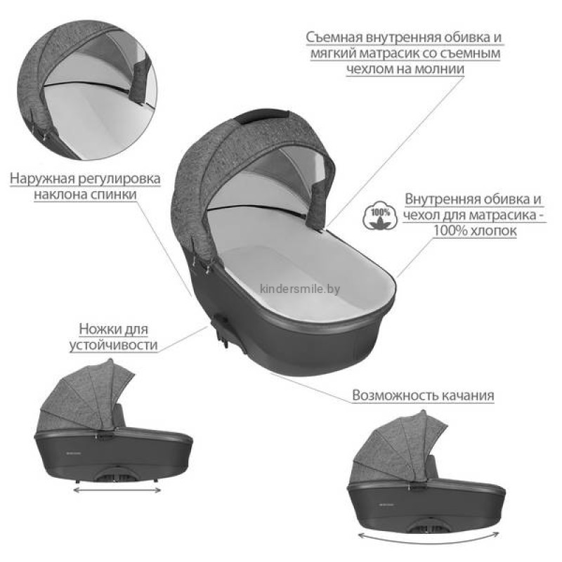 - Для переноски люльки: удобные боковые ручки, ручка на капюшоне.