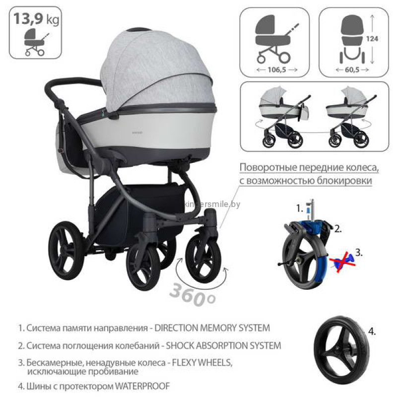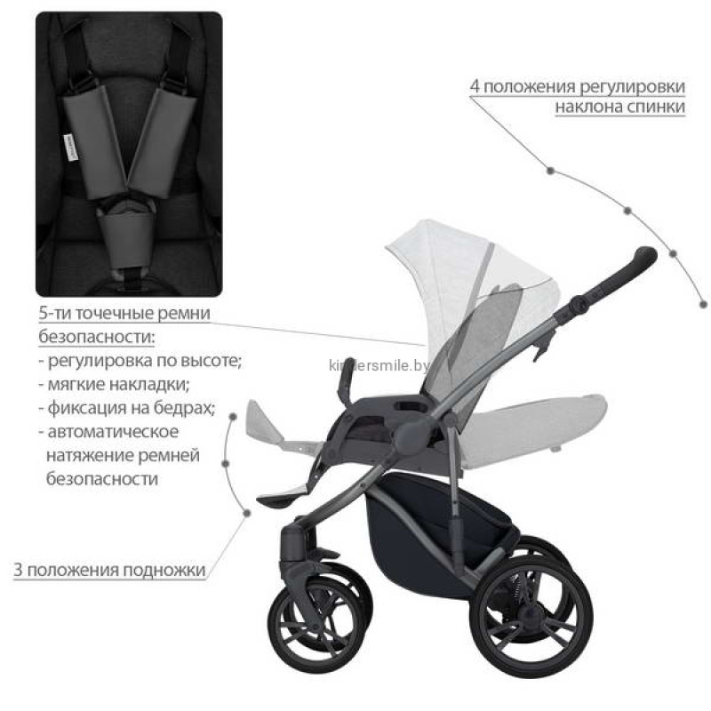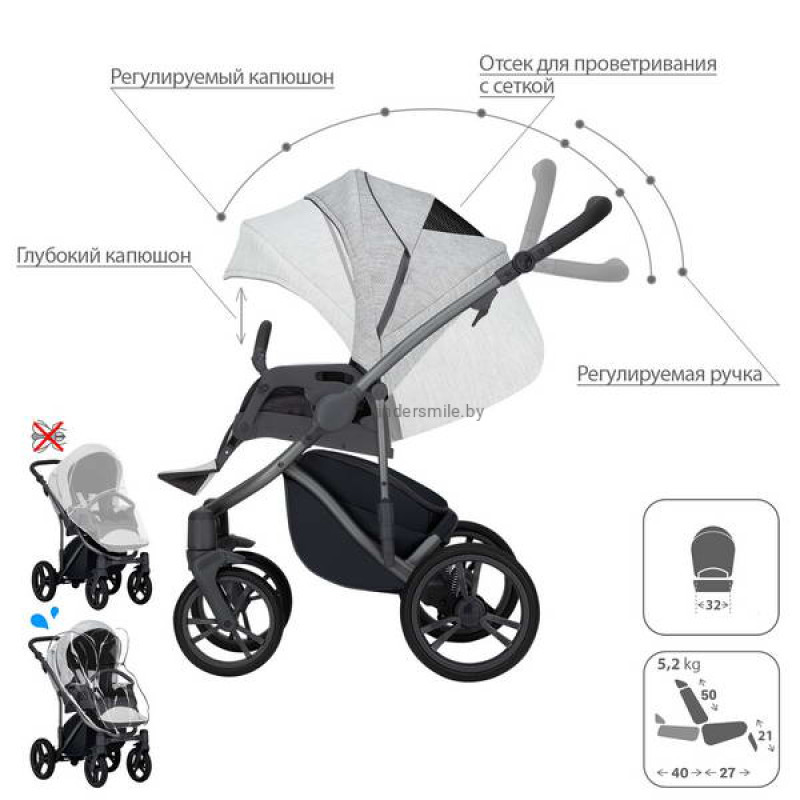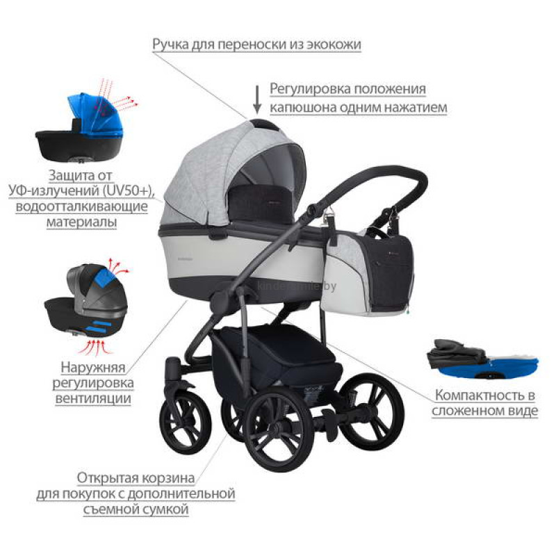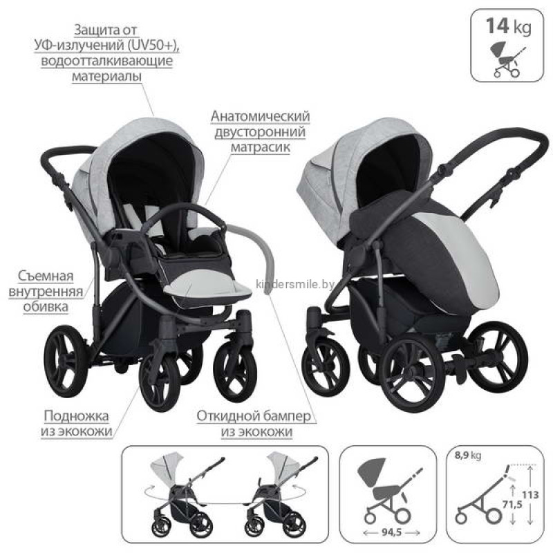 - Обивка коляски: водоотталкивающая, съемная, с УФ-защитой 50+.