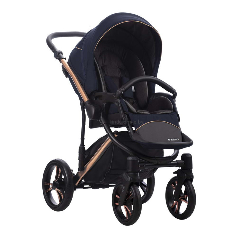 Bebetto Bresso Premium Class – это коляска для самых требовательных покупателей. Данная модель сочетает в себе дизайн высшего класса и инновационные решения, обеспечивающие комфорт для Вас и Вашего ребенка. Отличительными особенностями данной модели являются изысканный дизайн рамы, дисков колес и ободка на люльке, выполненных в цветах благородных металлов, а особенную неповторимость ее дизайну придает люлька с карбоновой текстурой дна. Для Вашего удобства в Bebetto Bresso Premium Class предусмотрено 2 способа регулировки капора спального блока и снятия люльки. В данной модели Вы можете отрегулировать капор легким нажатием на капюшон спального блока сверху или при помощи двух кнопок, расположенных с внутренней стороны люльки. Также Вы можете выбрать способ снятия люльки с шасси: рычаг, расположенный на дне спального блока, или кнопки, симметрично расположенные на боковых креплениях люльки к раме. Приятным дополнением ко всему вышеперечисленному станет крепление чехла люльки и капюшона к спальному блоку с помощью молнии и мягкий непромокаемый матрасик со съемным чехлом из бамбука. Bebetto Bresso Premium Class – это коляска для тех, кто любит быть в центре внимания.