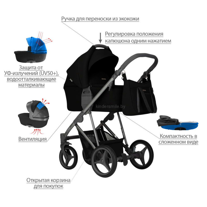- Обивка коляски: водоотталкивающая, съемная, с УФ-защитой 50+.