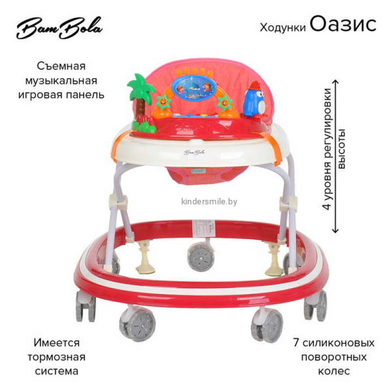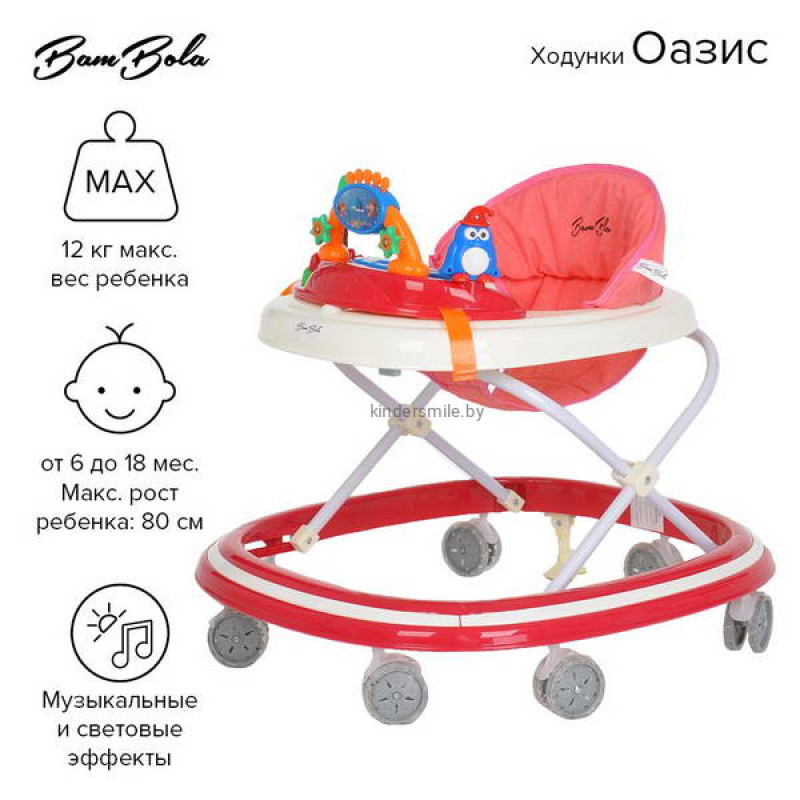 Ходунки Bambola Оазис подготовят малыша к первым самостоятельным шагам, развивают координацию движений и помогают ребенку научиться держать равновесие. Имеют съемную музыкальную игровую панель со световыми и звуковыми эффектами. Мягкое, удобное сиденье. Ходунки легко регулируются в зависимости от роста ребенка. Характеристики: