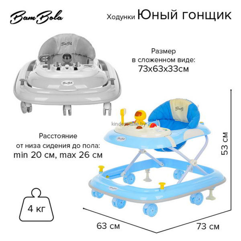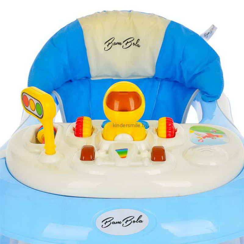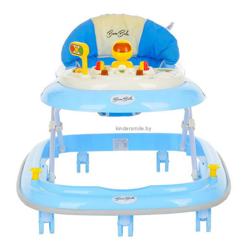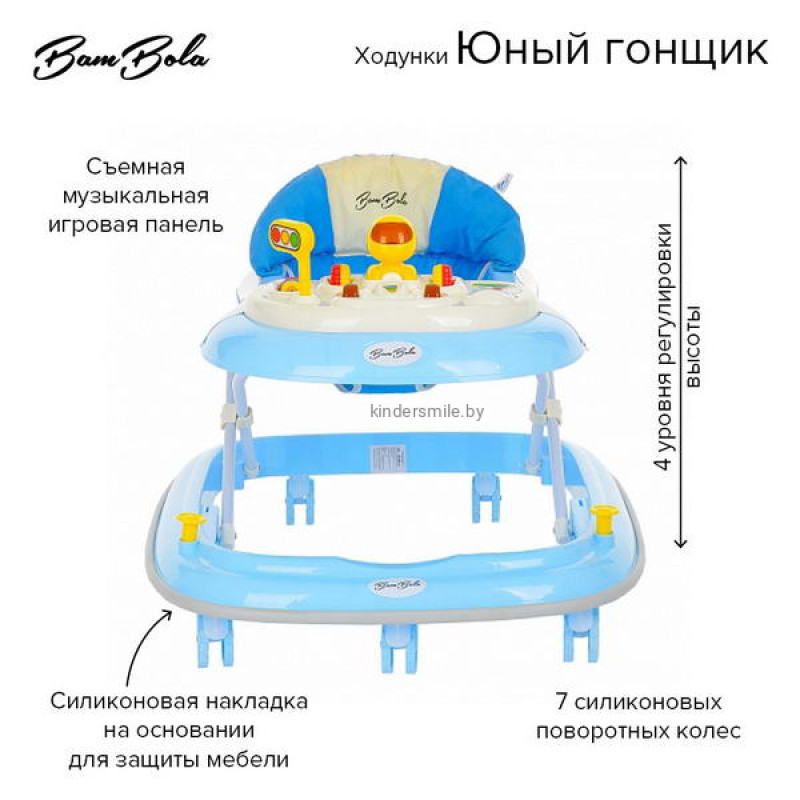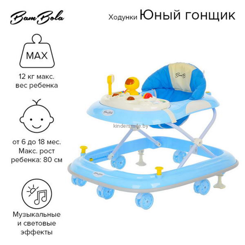 Ходунки Bambola Юный гонщик подготовят малыша к первым самостоятельным шагам, развивают координацию движений и помогают ребенку научиться держать равновесие. Имеют съемную музыкальную игровую панель. Мягкое, удобное сиденье. Ходунки легко регулируются в зависимости от роста ребенка. Характеристики: