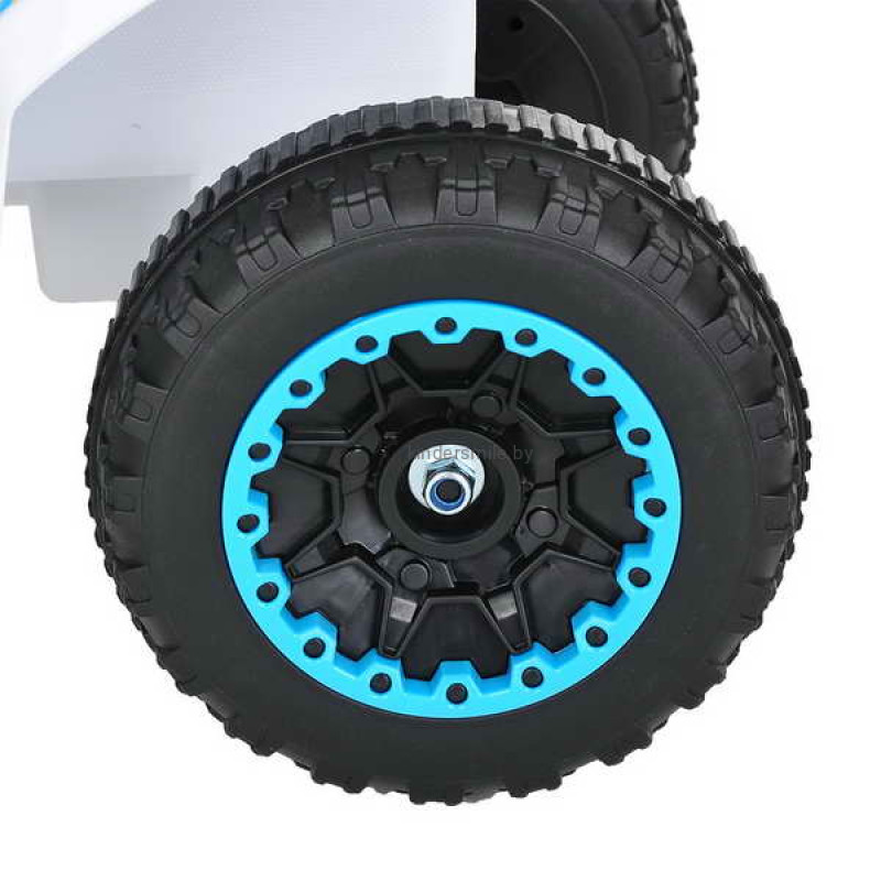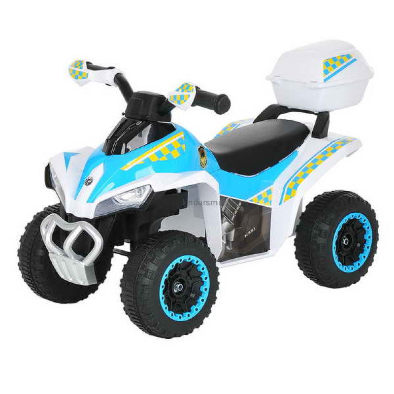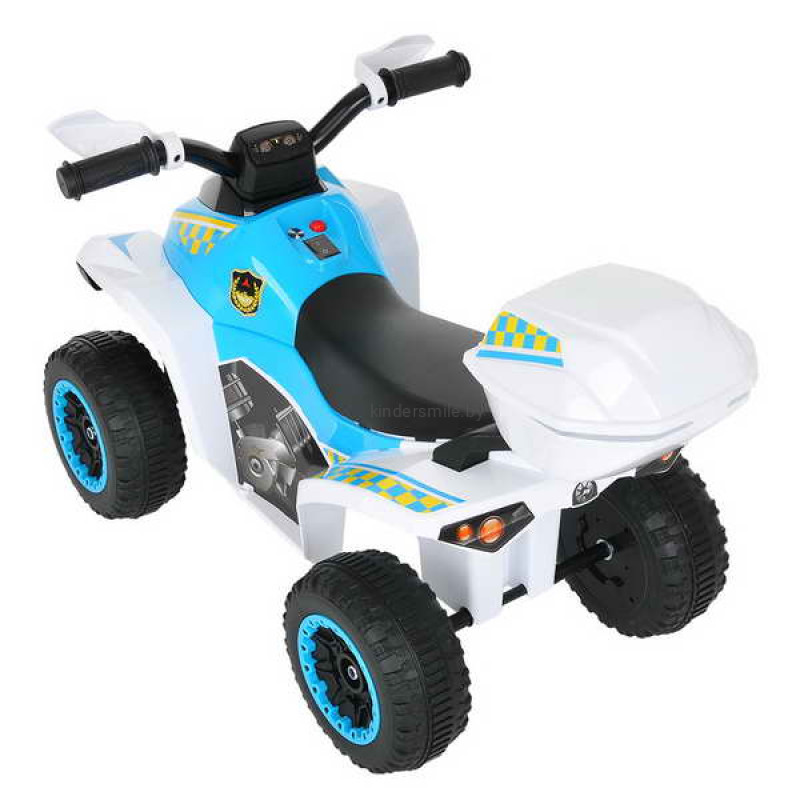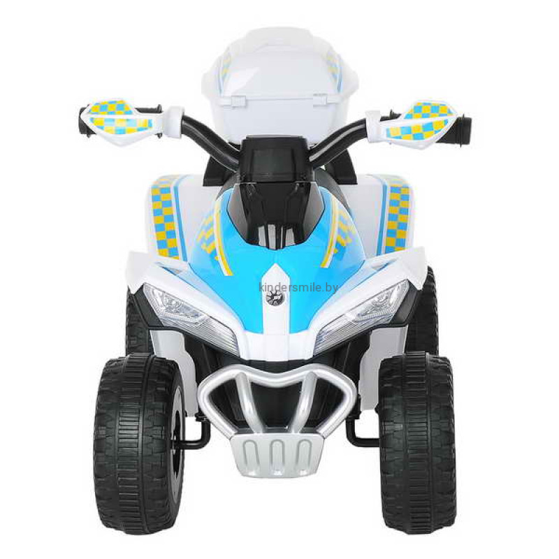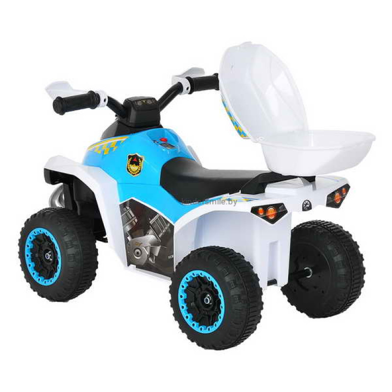 Модель выполнена в форме квадроцикла, имеет большие колеса с рисунком на шинах и просторное сиденье для комфортной посадки.